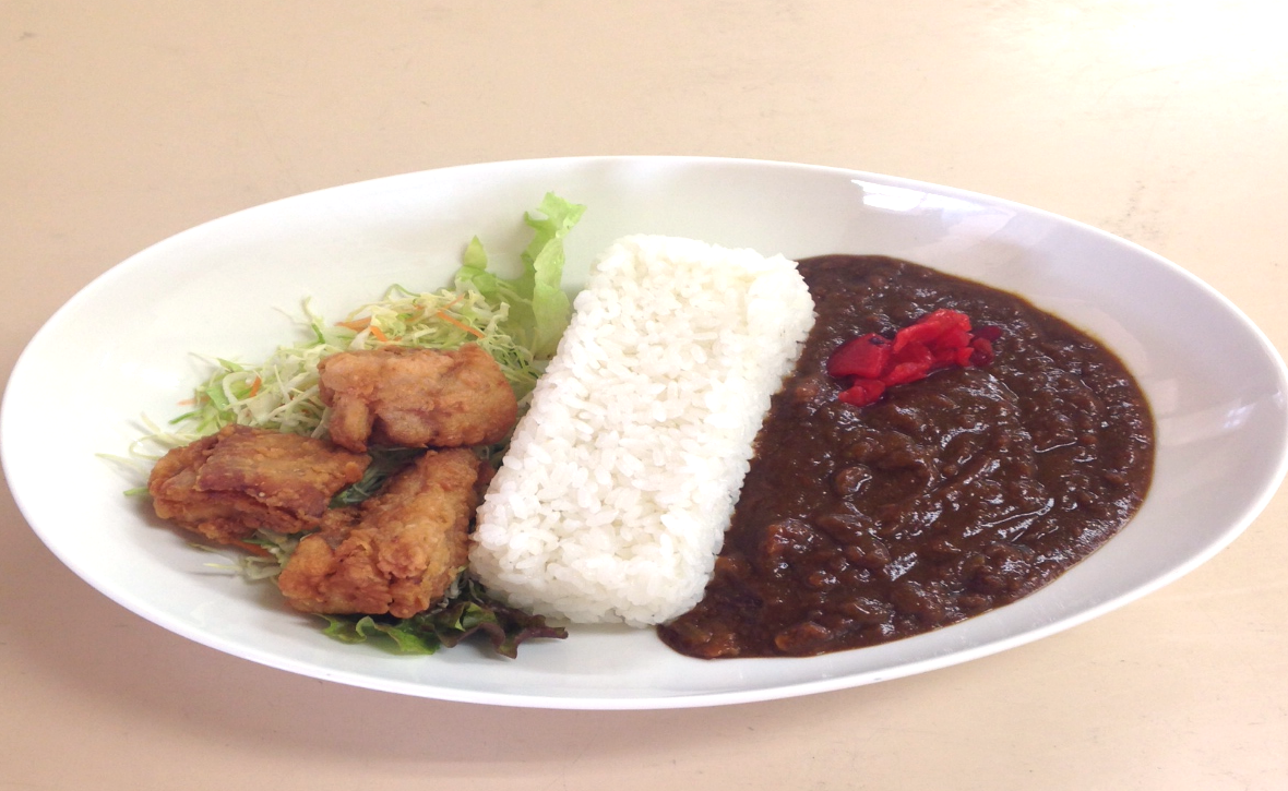 「お食事処 湖畔亭」のダムカレーには、三つの唐揚げが添えられています。